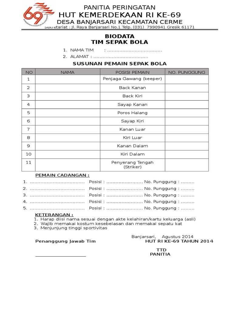 Contoh Format Daftar Pemain Sepak Bola Joonka from dammamfootball.files.wordpress.com Maybe you would like to learn more about one of these? Daftar susunan pemain sepak bola. Check spelling or type a new query. We did not find results for:
